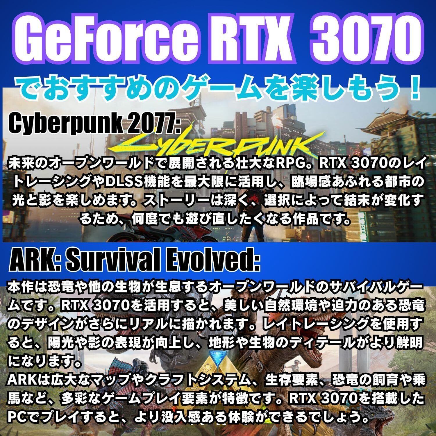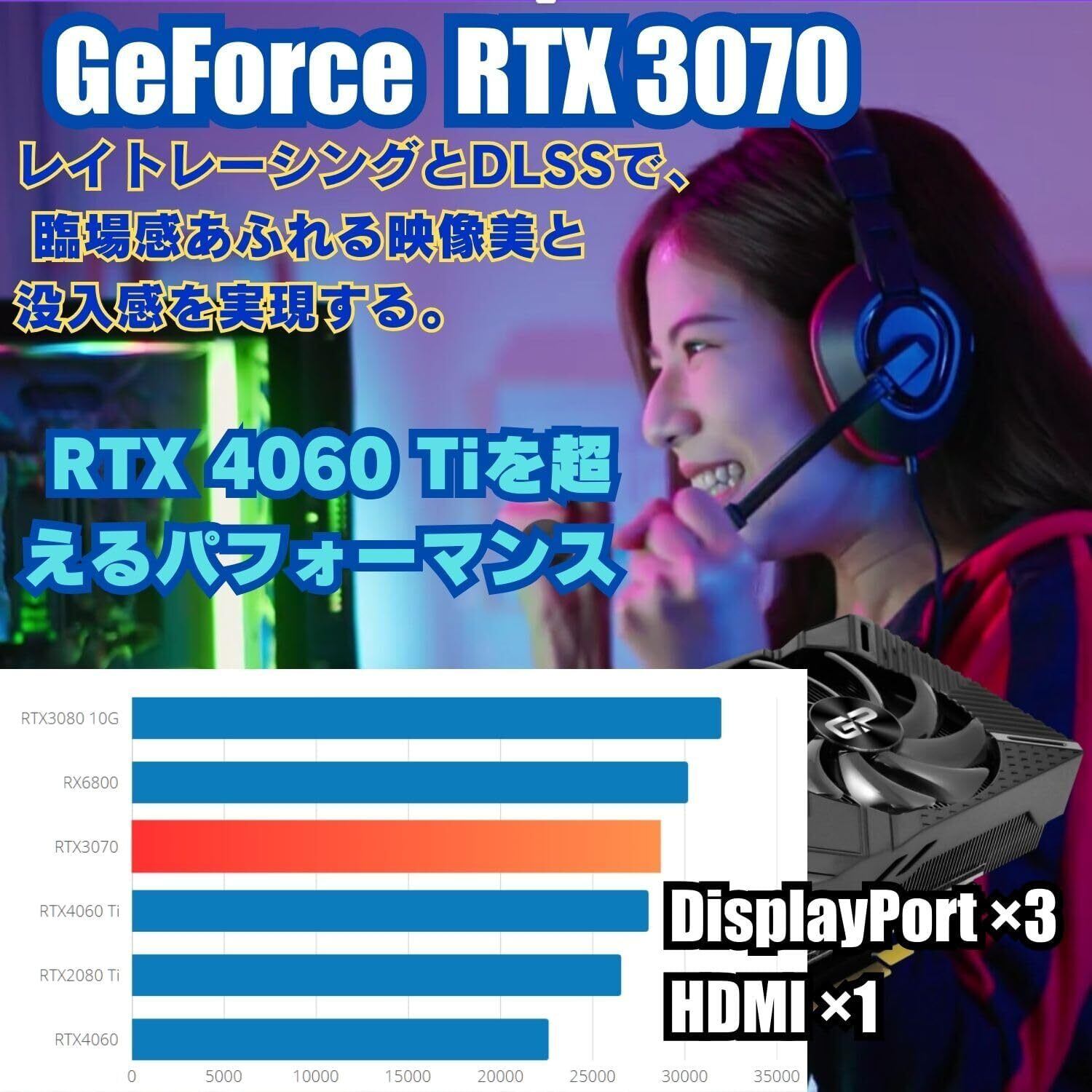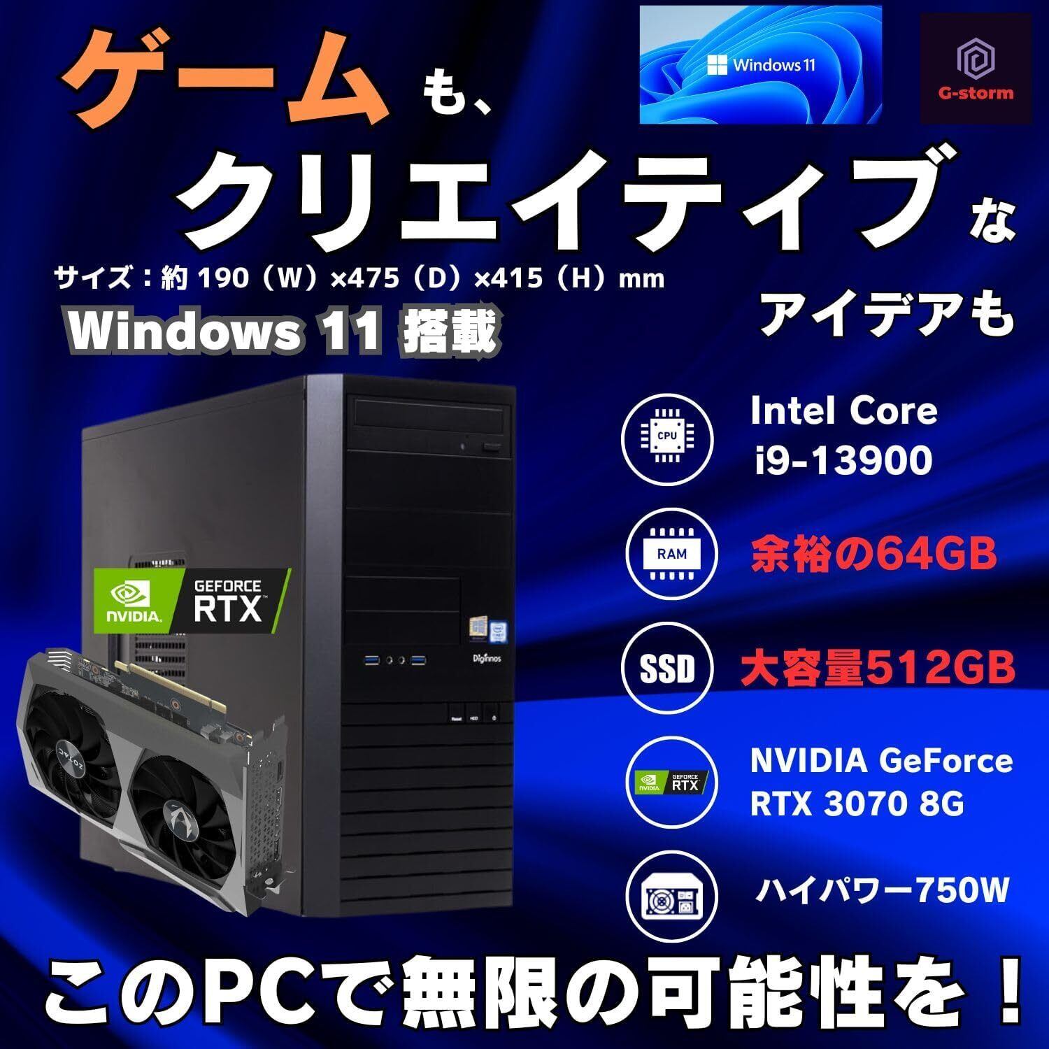 【RTX 3070搭載|生成AIや映像制作に最適】 NVIDIA GeForce RTX 3070(8GB VRAM)を搭載し、リアルタイムレイトレーシングやCUDA演算処理にも強力対応。生成AI(Stable Diffusion、ControlNet等)や4K映像編集、3Dレンダリングなどにおいても高い処理性能を発揮します。