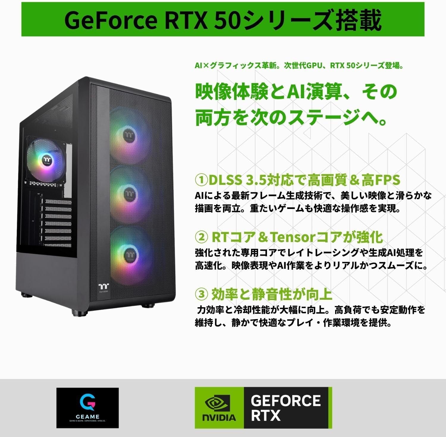✅【Geame正規新品モデル】プロ品質の高コスパゲーミングPC Geame(ジーム)は「ゲーム+創造」をテーマにした次世代ブランド。本機は高性能パーツを用いて構成された新品モデルで、配線・冷却・動作検査も丁寧に実施。ゲームにも制作にも真剣に取り組む方にふさわしい1台です。
