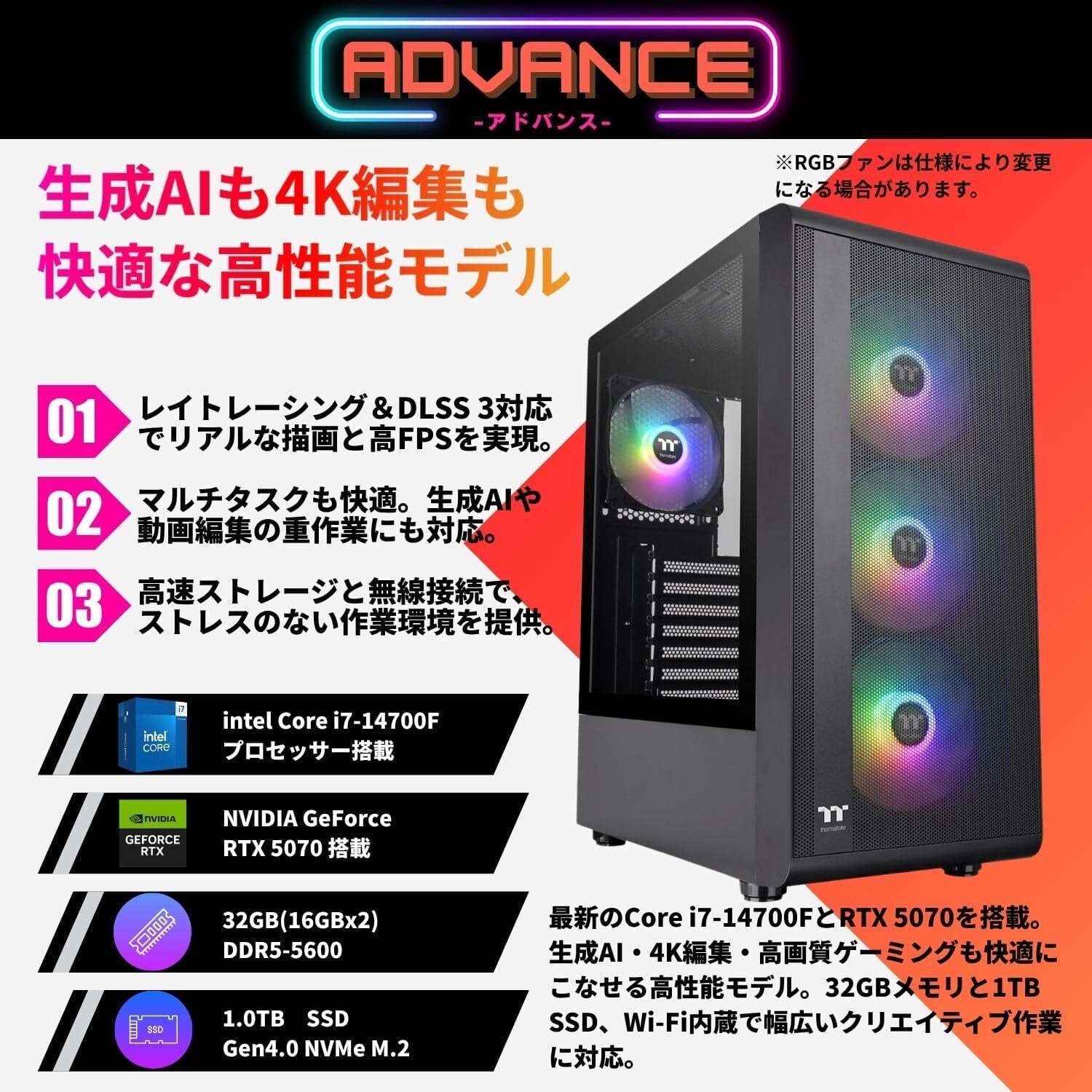 ✅【Core i7-14700F搭載】14コア20スレッドの高性能CPU 第14世代Intel Core i7-14700Fを搭載。8つの高性能コアと6つの高効率コアによるハイブリッド構成で、ゲーム、編集、配信、生成AIまで幅広く対応。最大5.4GHzの高クロックで快適な動作を実現します。