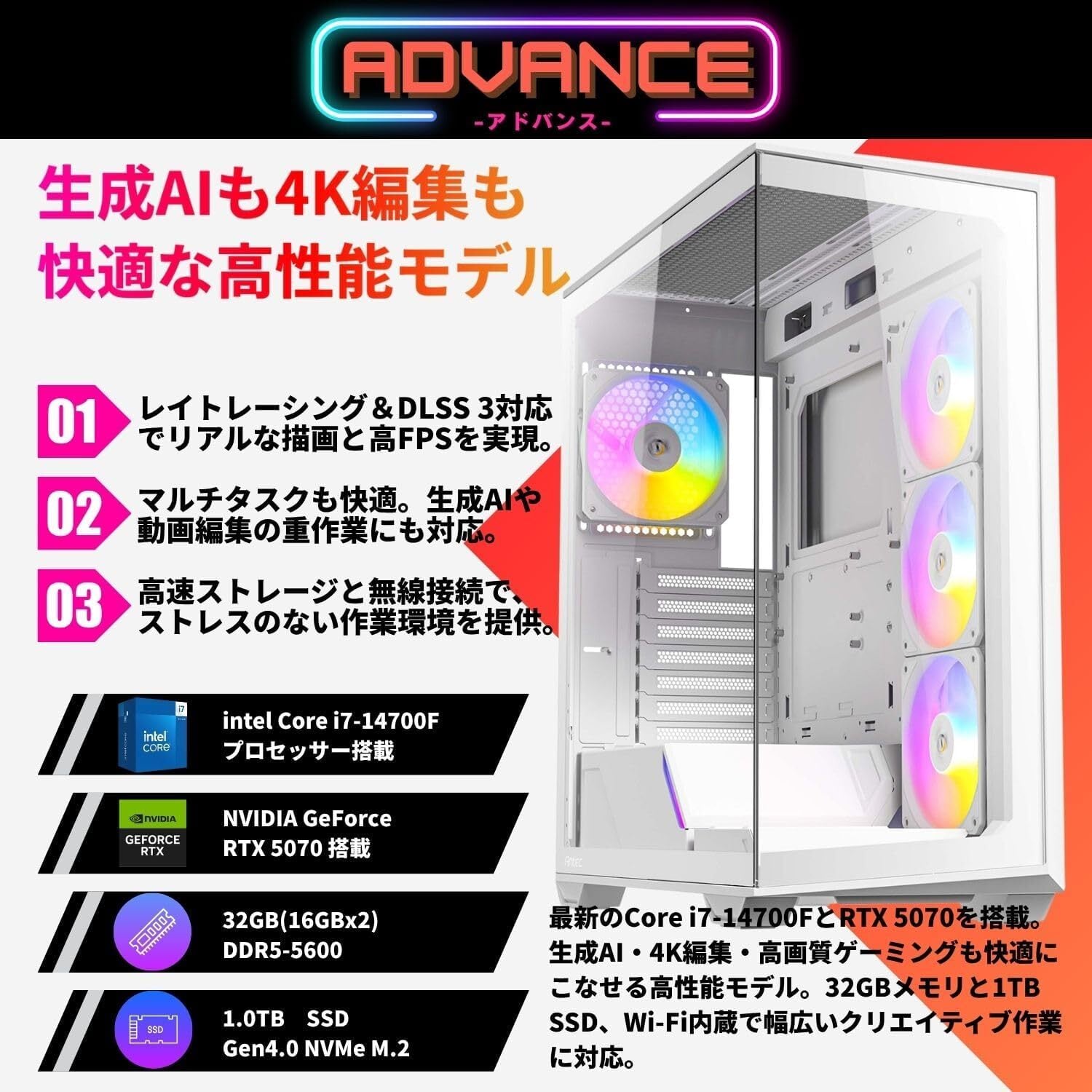 ✅【GeForce RTX 5070搭載】AI対応の次世代GPU RTX 5070は最新のAdaアーキテクチャを採用し、DLSS 3とレイトレーシングに対応。Apex LegendsやVALORANTなどの人気ゲームを高設定・高フレームレートで動作可能。画像生成や動画編集など、プロクリエイティブ用途にも対応する高性能GPUです。