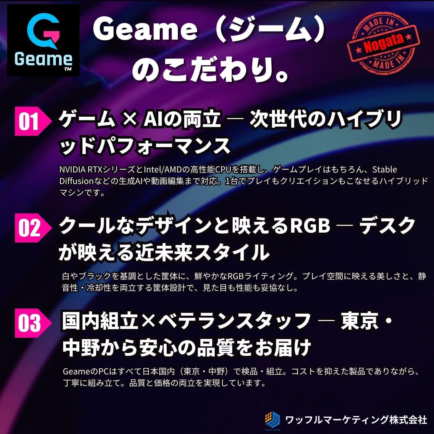 ✅【Geame正規新品モデル】安心の品質とコストパフォーマンス Geame(ジーム)は「Game × Creation」をテーマにした高品質PCブランド。本機は全パーツ新品・検品済み。冷却設計やケーブル処理にもこだわり、ゲーム・クリエイティブ・AI用途まで幅広く対応する、価格以上の実力を備えた一台です。