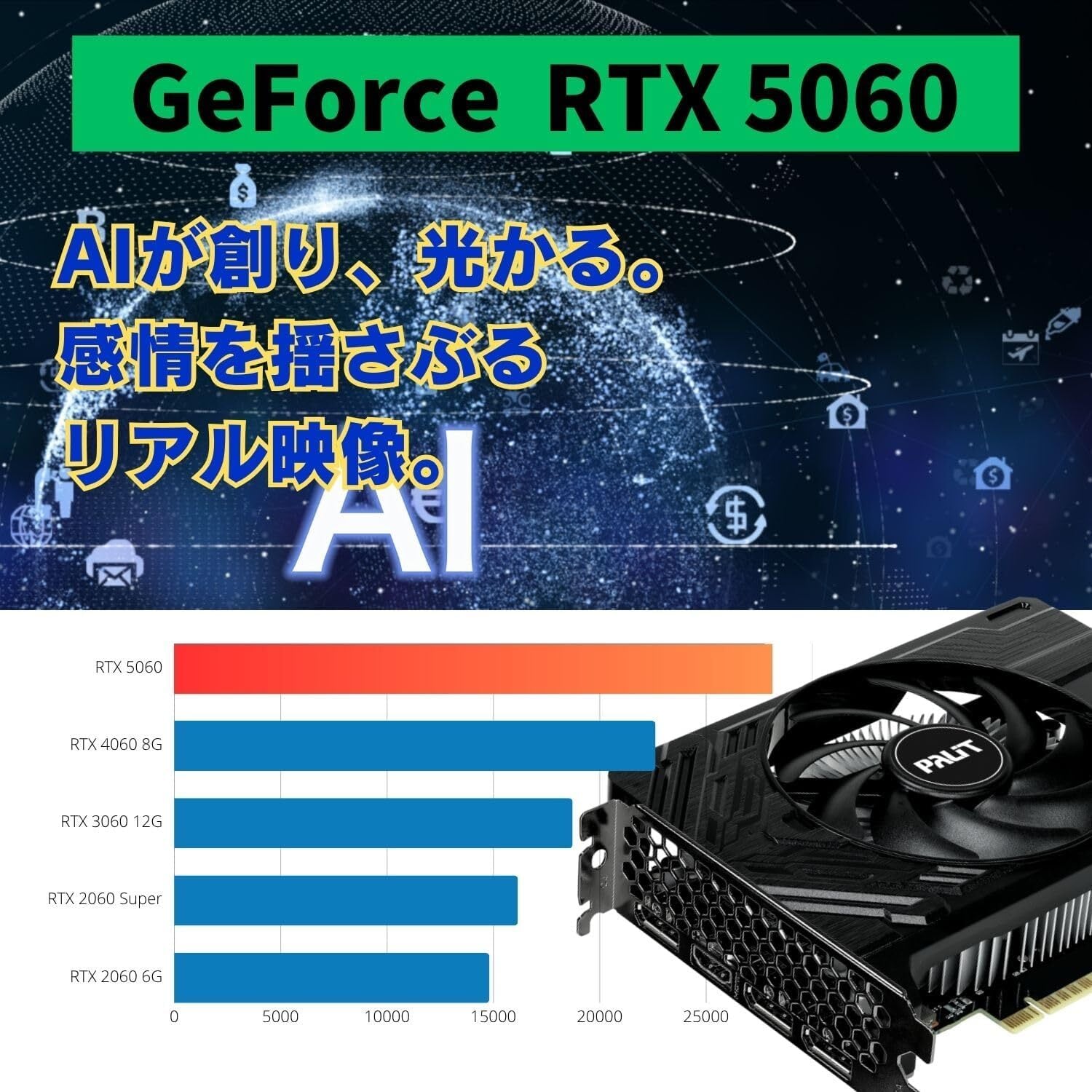✅【最新GeForce RTX 5060搭載】DLSS 3.5・レイトレーシング対応 NVIDIA最新アーキテクチャを採用したRTX 5060は、DLSS 3.5とレイトレーシングに対応。フォートナイトやApex Legendsなどの人気ゲームを高画質&高FPSで快適にプレイでき、生成AI・画像生成・映像処理でも優れたパフォーマンスを発揮します。