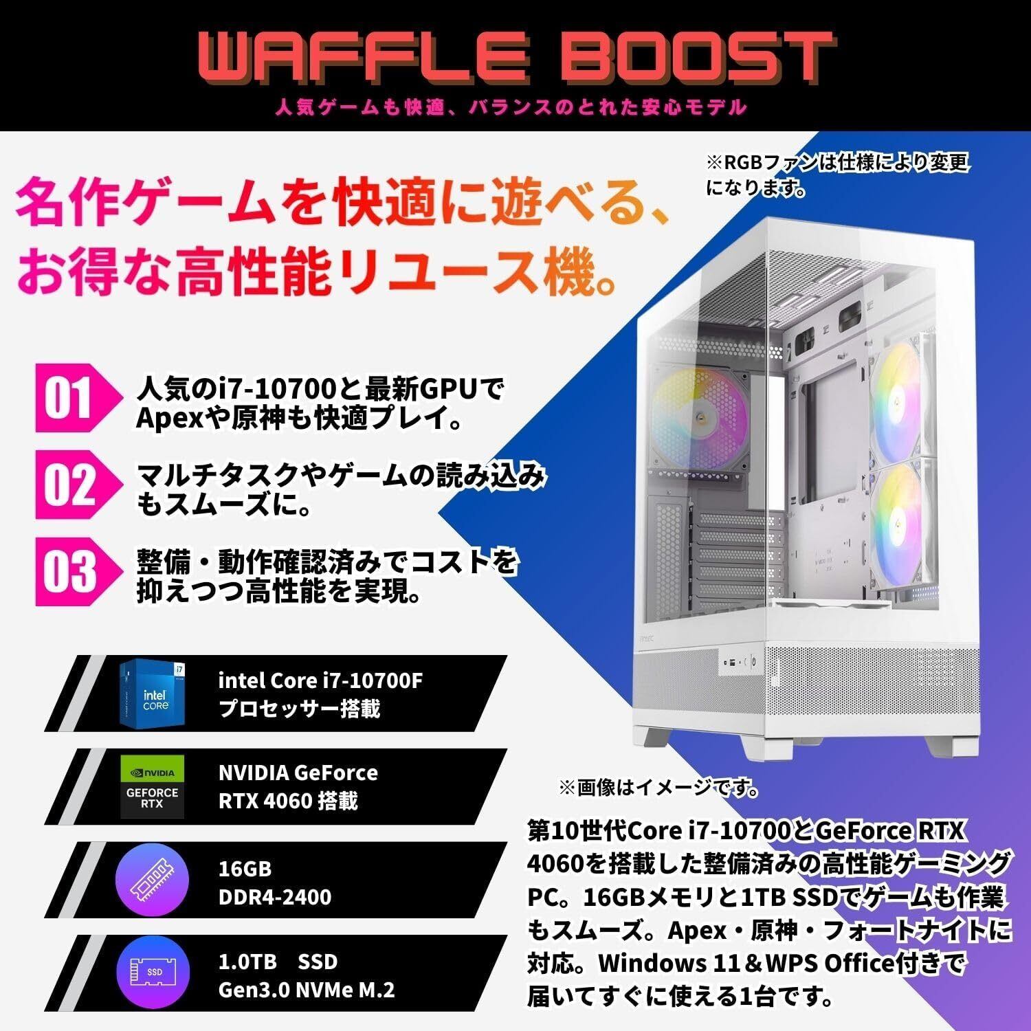 【整備済み品】ゲーミングPC デスクトップ タワー型 G-StormR 第10世代 Core i7-10700 / RTX 4060 / メモリ16GB / SSD1.0TB / Windows 11 / WPS Office2付き / ホワイトモデル1 フォートナイト・原神・Apex対応 B0F9Y2T3J4