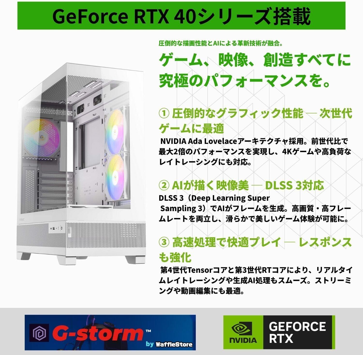【スタイリッシュなホワイトモデル ─ 高性能×美しさ】 清潔感のあるホワイト筐体にRGBファンを搭載。デスク上でも映えるスタイリッシュなデザインで、インテリアとの相性も抜群。機能性とビジュアルを両立した、こだわり派にも応える一台です。