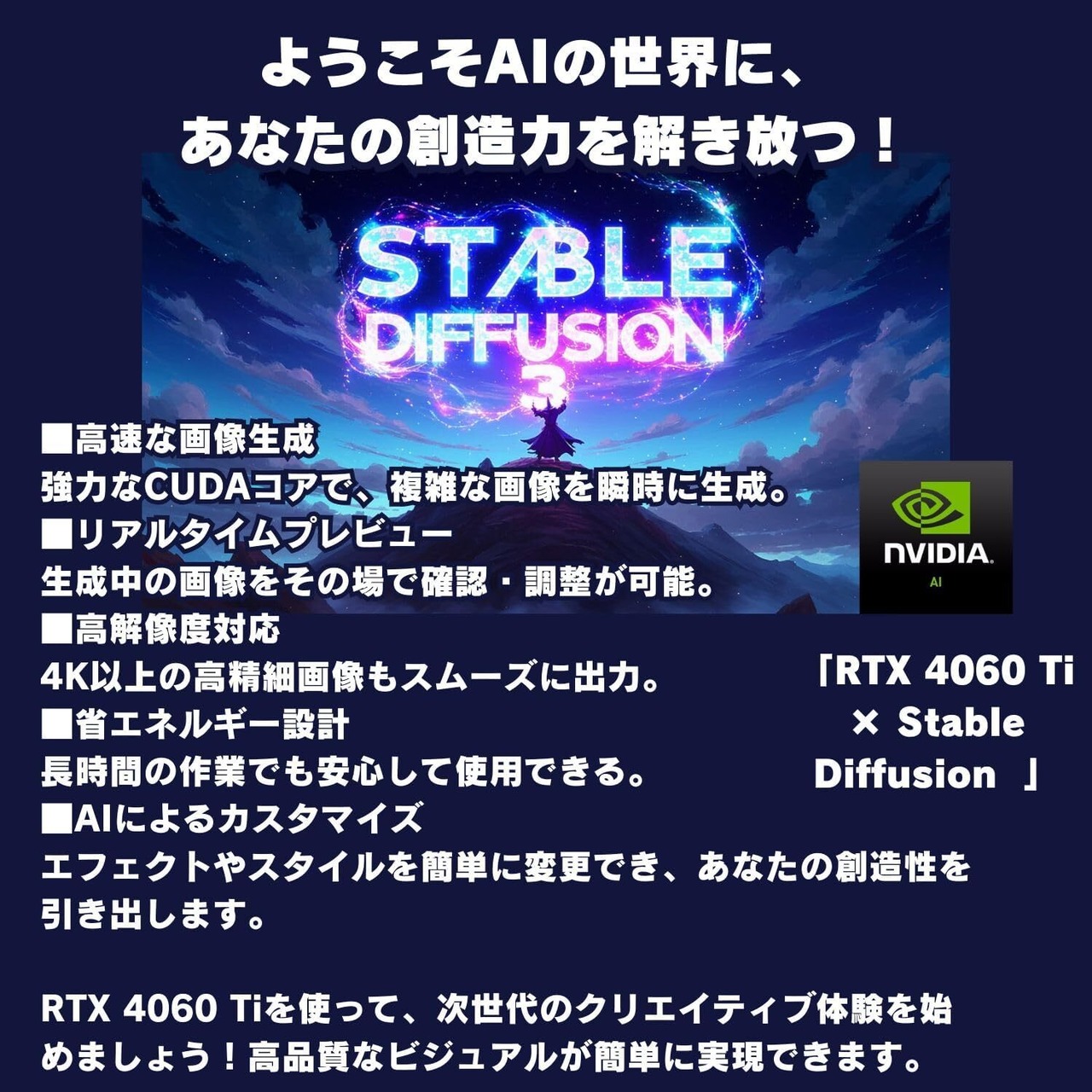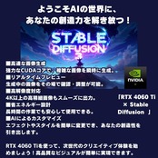 2. **NVIDIA GeForce RTX 4060 Ti 8GB グラフィックカード** NVIDIA GeForce RTX 4060 Ti 8GBを搭載し、リアルタイムのレイトレーシングとDLSS 3.0技術により、ゲームのグラフィックを驚異的なリアリティで再現します。4K解像度のゲームや映像制作に加えて、VR(バーチャルリアリティ)環境でも高いフレームレートと安定した描画性能を発揮。さらに、生成AI技術(Generative AI)に対応しており、AIアシストによるアートワークの生成や3Dモデリングもスムーズに行えます。ゲームだけでなく、AIを活用したクリエイティブな作業にも最適な環境を提供します。