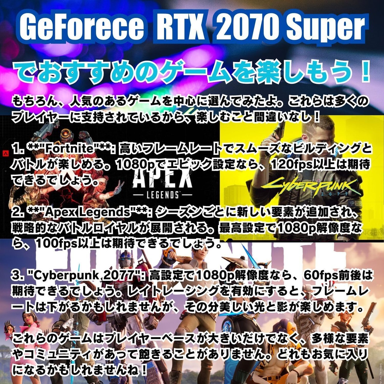 2. グラフィックスと映像品質:** - このゲーミングPCは、NVIDIA GeForce RTX 2070 Superグラフィックスカードを搭載しています。RTX 2070 Superは、リアルタイムレイトレーシング技術とAI強化機能を備えており、非常にリアルで美しい映像表現が可能です。4K解像度でのゲームプレイやVR体験にも対応しており、高フレームレートと低遅延を実現します。最新のゲームタイトルも高設定で快適にプレイでき、没入感のあるゲーミング体験を提供します。