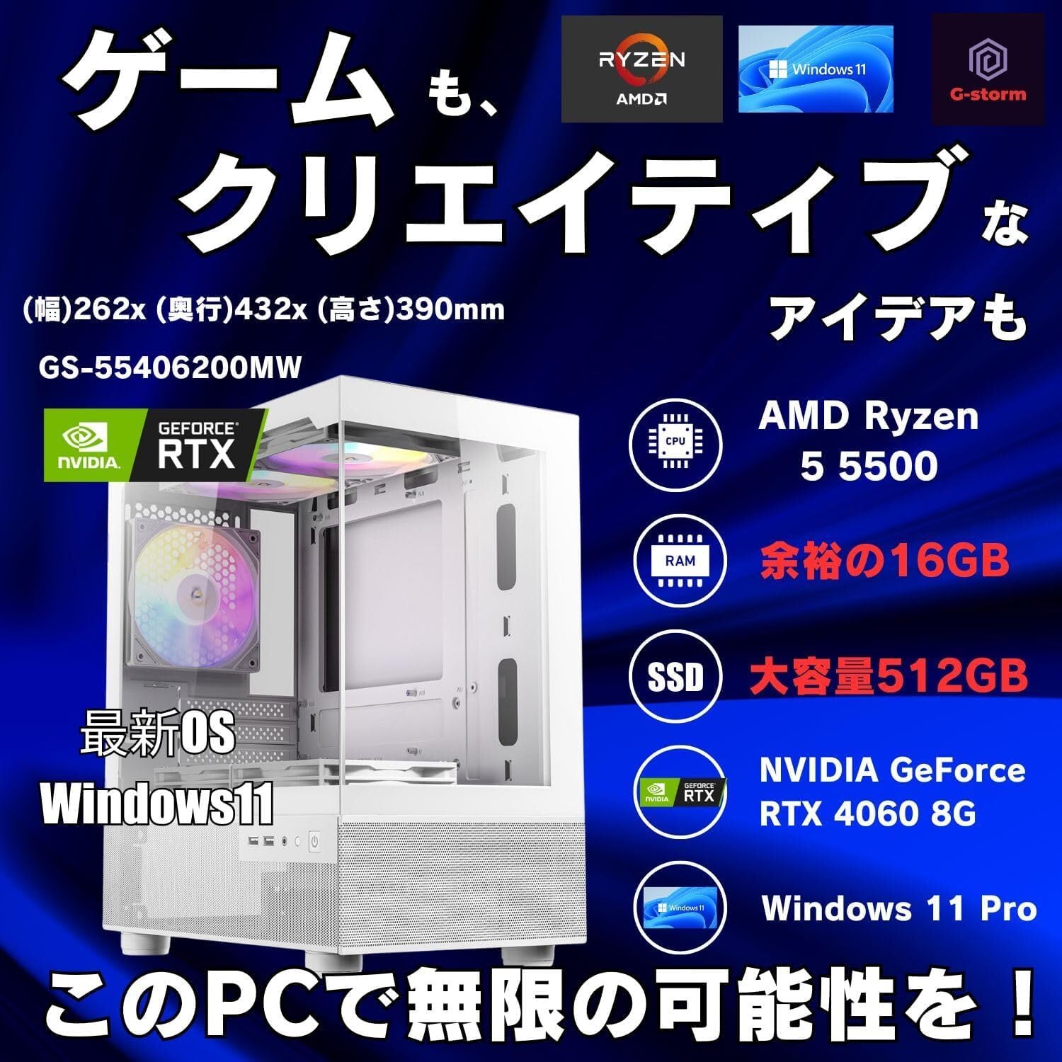 WaffleMK ゲーミングPC タワー型 G-Stormシリーズ AMD GeForce 16GBメモリ Windows 11 WPS Office2 SSD512GB Ryzen 5 5500 RTX 4060 CX200M ホワイト B0DMR8F7KZ