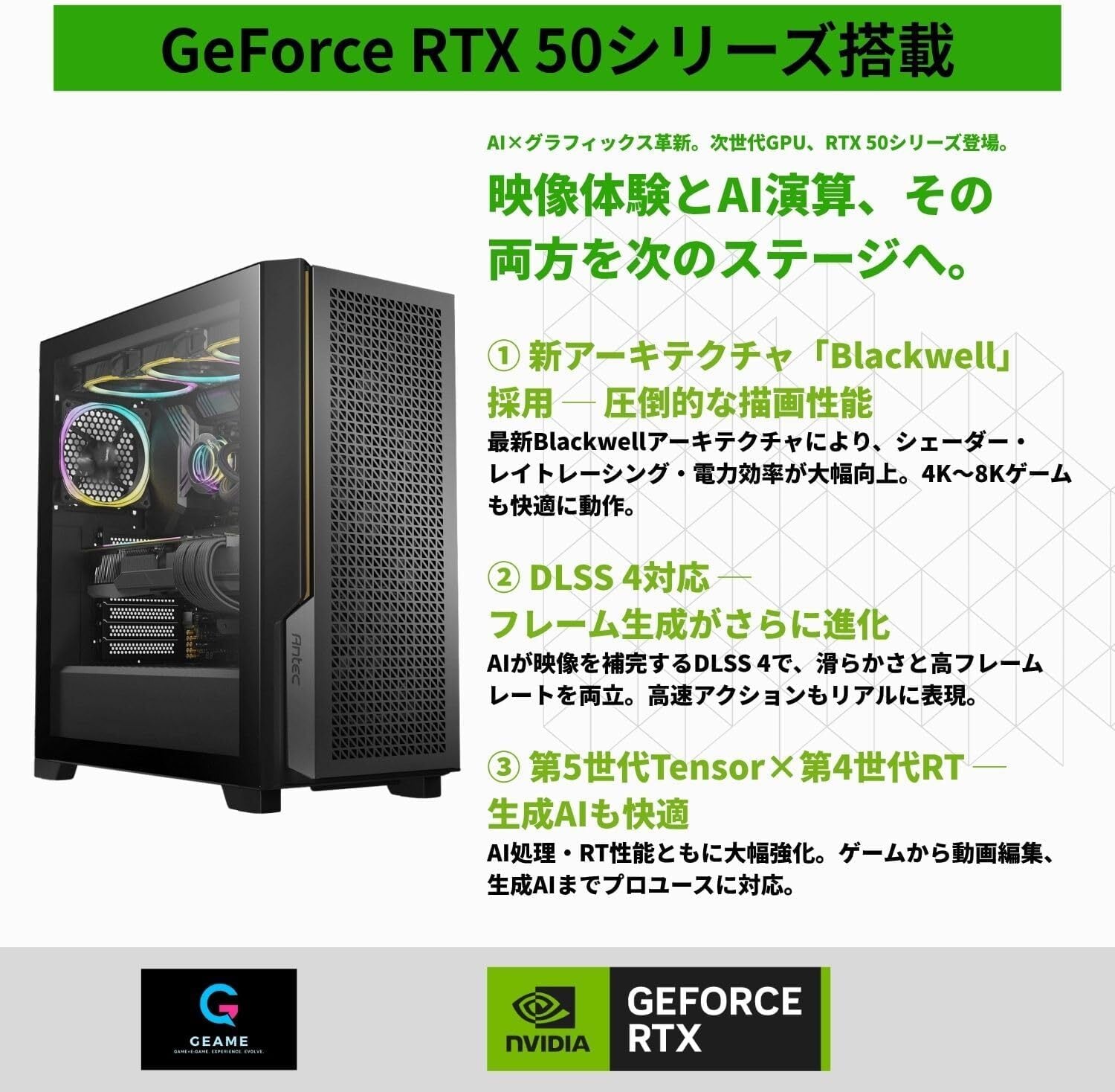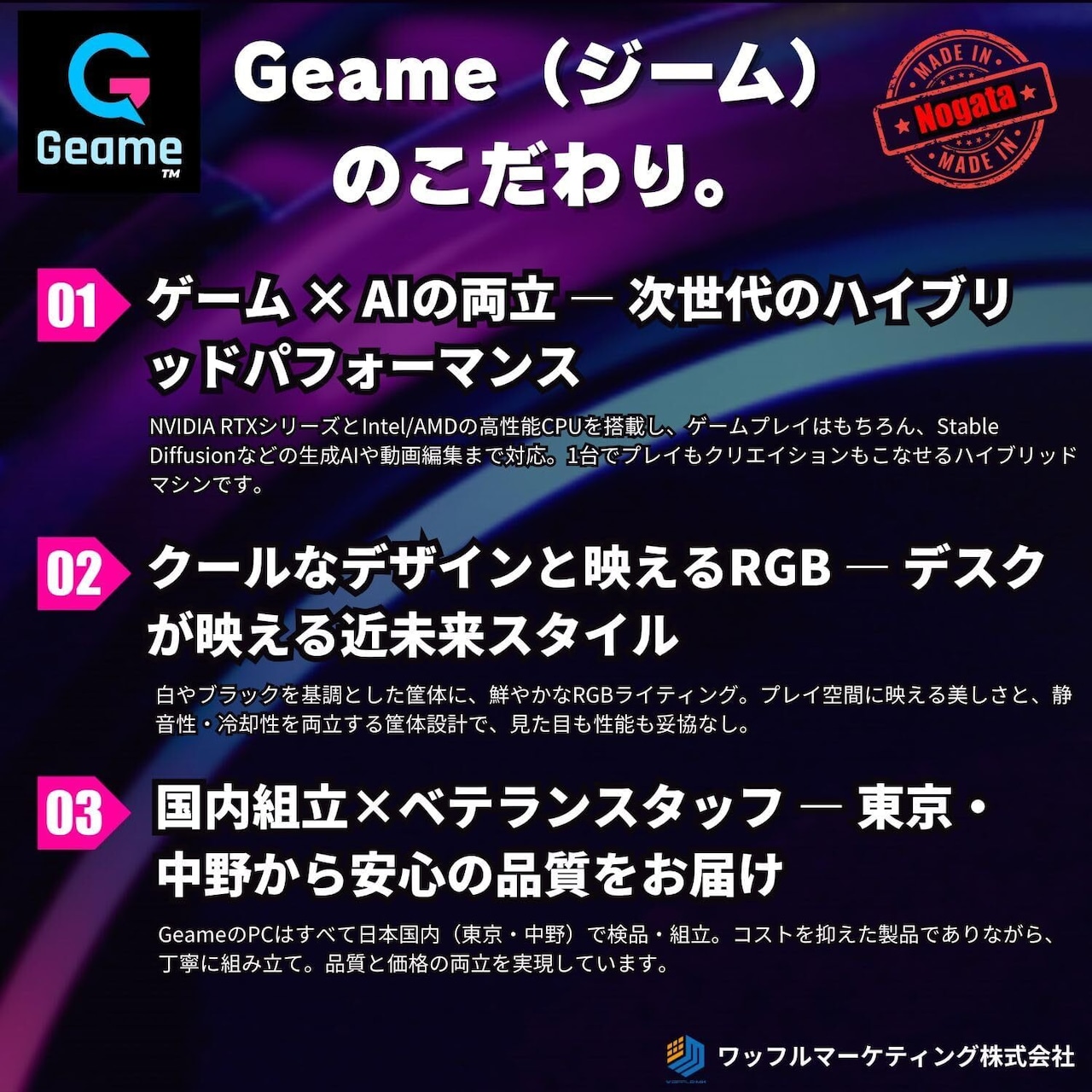 ✅【Geame正規新品モデル】品質とコストパフォーマンスの両立 Geame(ジーム)は、「ゲーム × 創造」をテーマとする次世代ブランド。本機はすべて新品パーツを使用し、冷却・配線・動作確認まで丁寧に仕上げた高品質モデル。ゲーマー、配信者、クリエイターすべてに応える一台です。