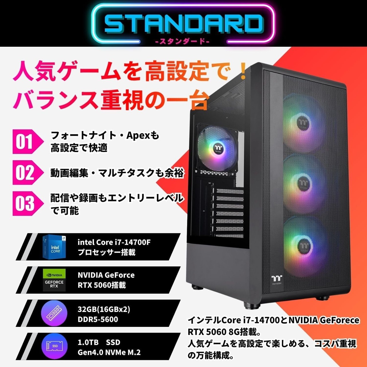 ✅【32GBメモリ+1TB SSD】快適なマルチタスク&高速ストレージ 32GBの大容量メモリで、ゲームプレイ中の録画・配信や動画編集などのマルチタスクにも余裕を持って対応。1TBのNVMe SSDは高速な読み書きが可能で、大容量データやアプリの起動もスムーズです。
