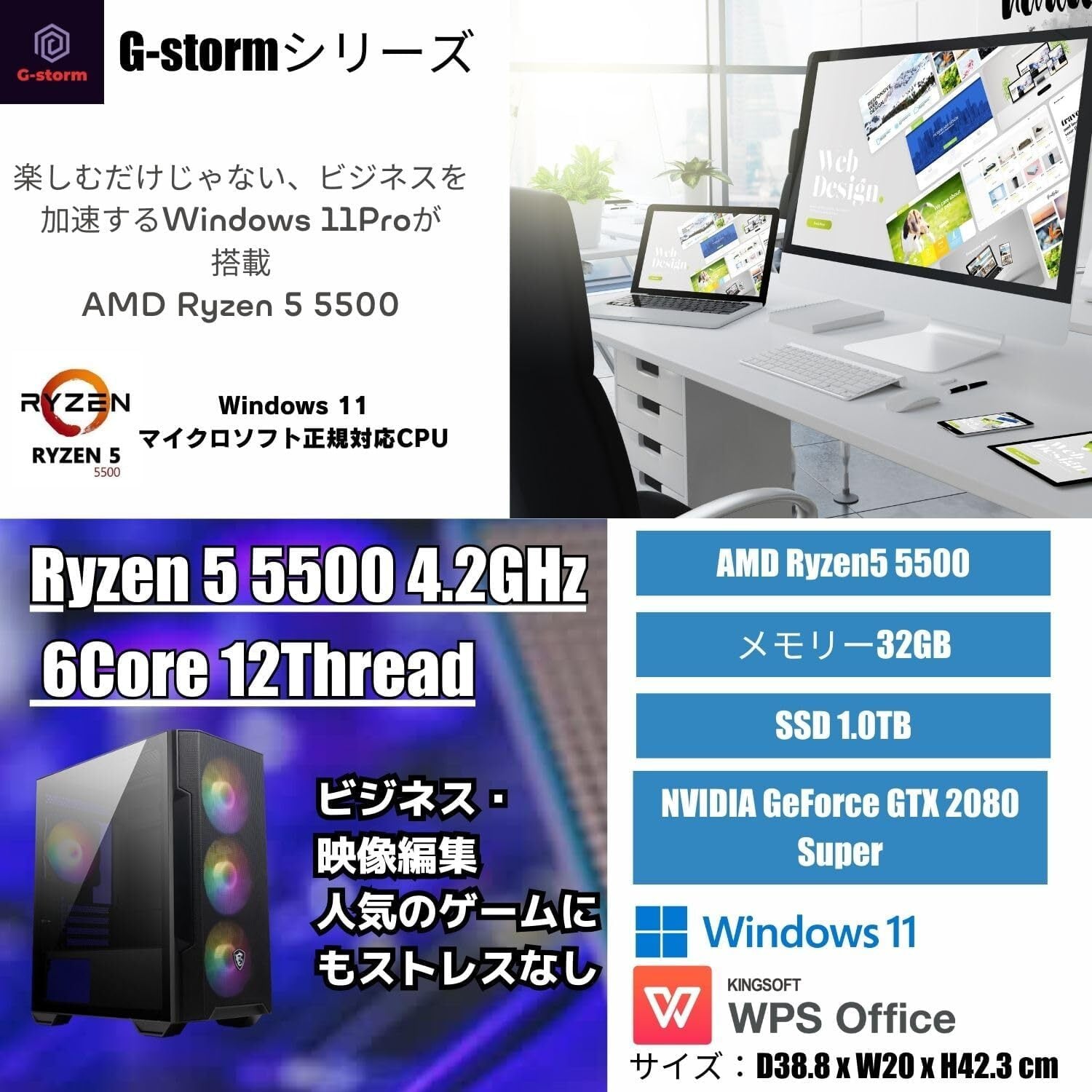 WaffleMK ゲーミングPC デスクトップPC タワー型 G-Storm AMD Ryzen 5 5500 CPU - GeForce RTX 2080 Super 32GBメモリ 1.0TBSSD Windows 11 生成AI VR B0CPHXFTRB