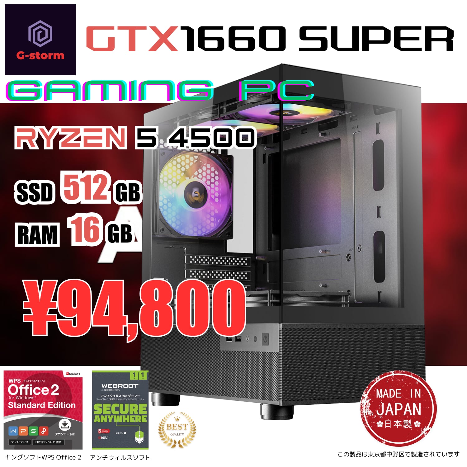 ケースが選べる!ゲーミングPC エントリーモデル デスクトップPC タワー型 G-Stormシリーズ Ryzen 5 4500 - GeForce GTX 1660 Super - 16GBメモリ - Windows 11 WPS Office2【整備済み品】